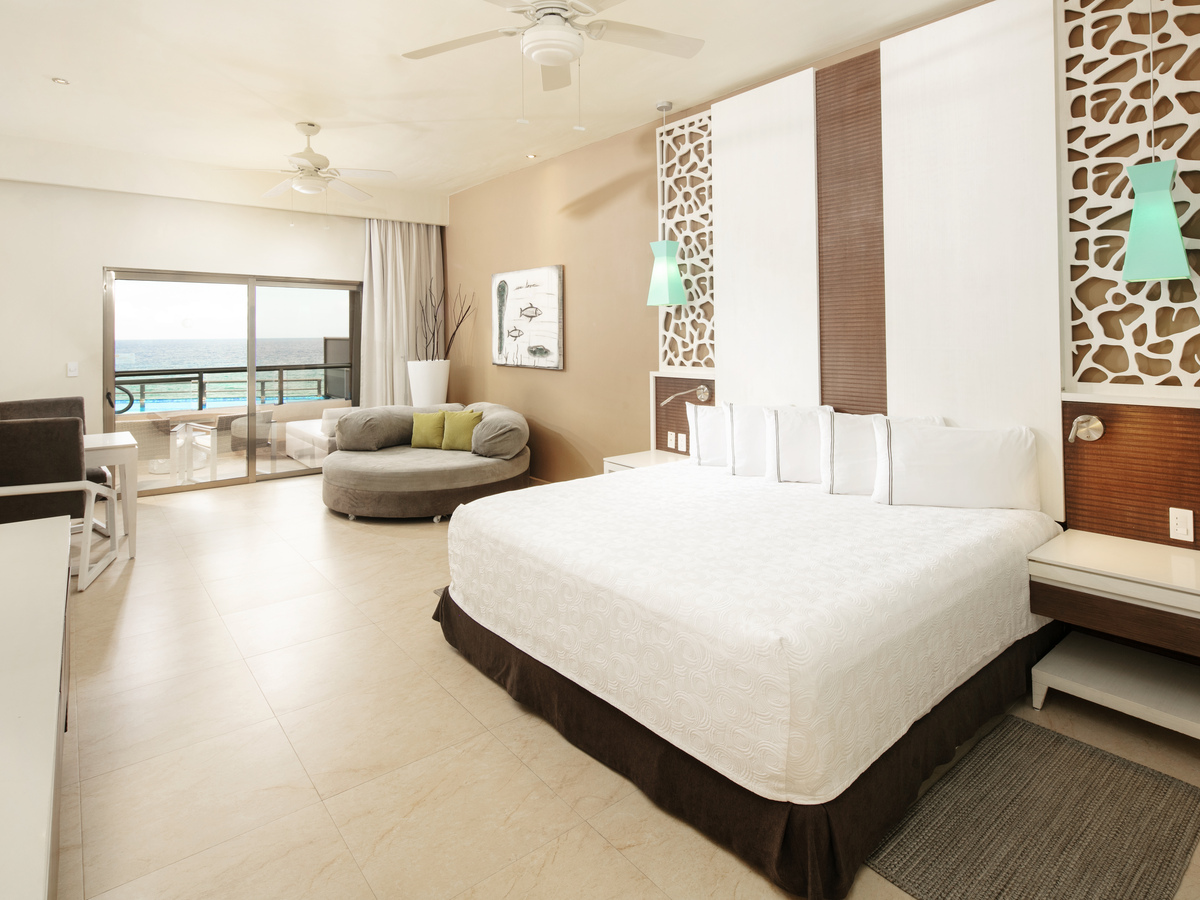 Esta elegante Suite con interior moderno crea un espacio íntimo lleno de confort y estilo. Cuenta con un dormitorio principal, una sala de estar independiente con bar y licores nacionales e internacionales de primera calidad. Maravillosas vistas de nuestro Mar Caribe. Dispone de una suntuosa decoración con dos pantallas de plasma, dos relajantes bañeras de hidromasaje para dos personas cada una, amenities de tocador y menú de almohadas, menú de aromaterapia Premium, batas y pantuflas, servicio de cobertura todas las noches, caja de seguridad, teléfono, minibar surtido a diario, cafetera, servicio de habitaciones 24 horas y Wi-Fi de cortesía. Disfruta del amplio balcón frontal con tumbonas y acceso a la piscina. Las suites disponen de cama King-size.