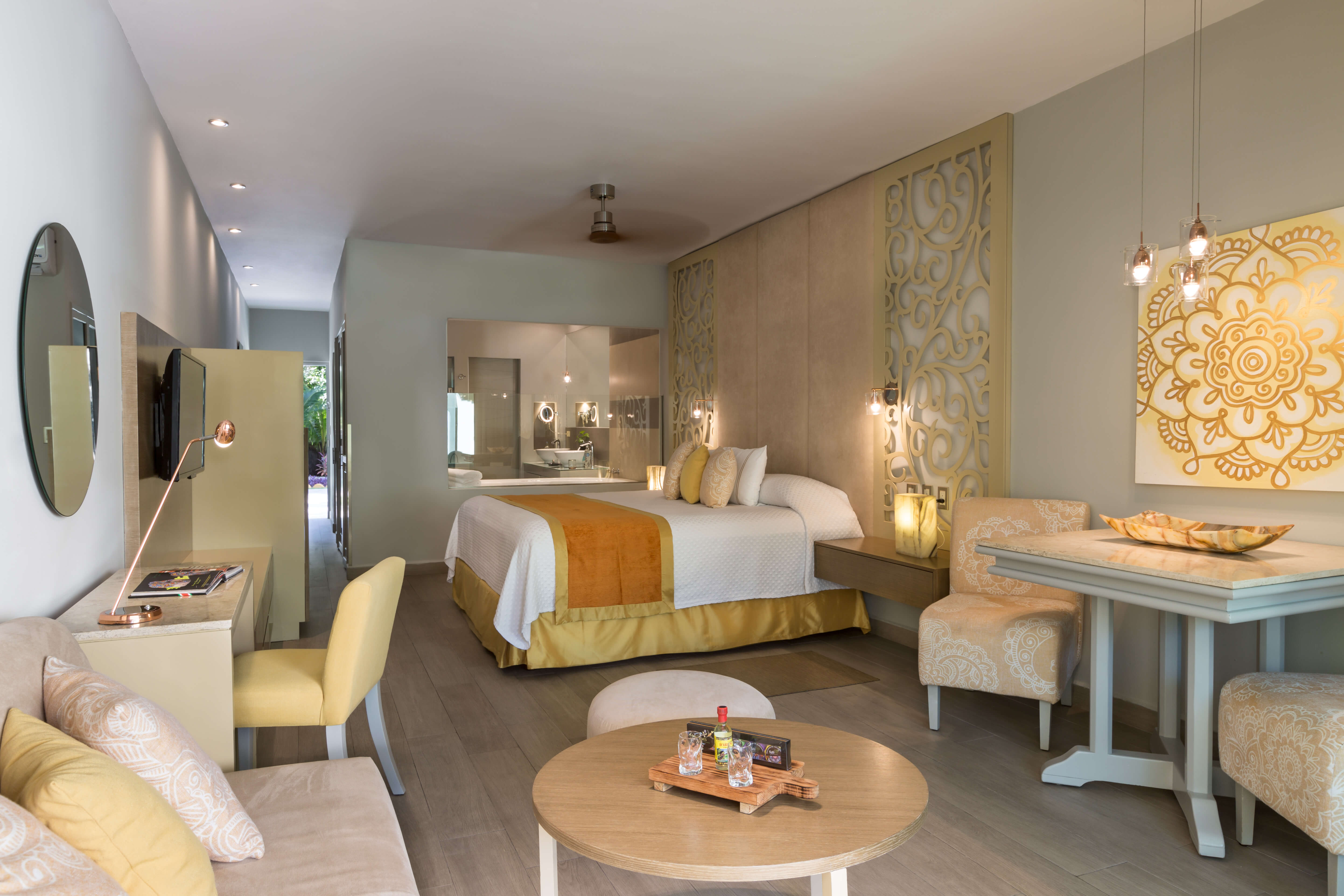 Estas suites se caracterizan por su elegancia, encanto y romanticismo, con la increíble brisa del Caribe, ideales para perderse en el momento y disfrutar de este paraíso. Incluye auténticos muebles de madera oscura con cama king, cada suite tiene baños contemporáneos equipados con una bañera de hidromasaje relajante, lavamanos doble y nuestras amenidades de autor, creando un ambiente relajante y romántico en su totalidad.